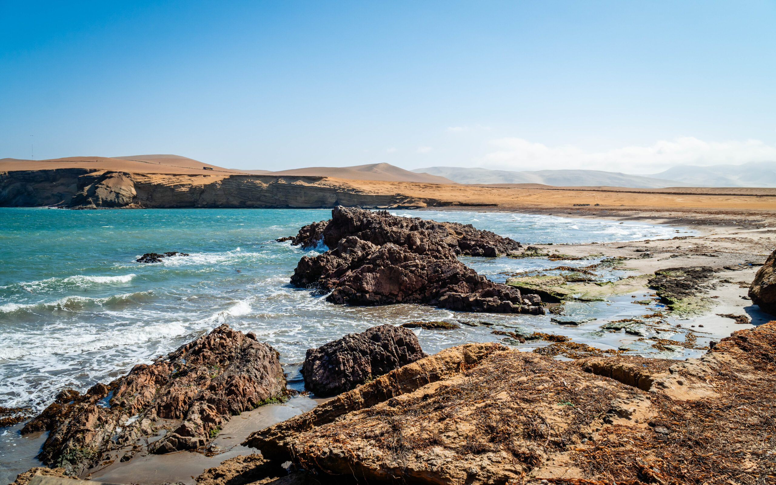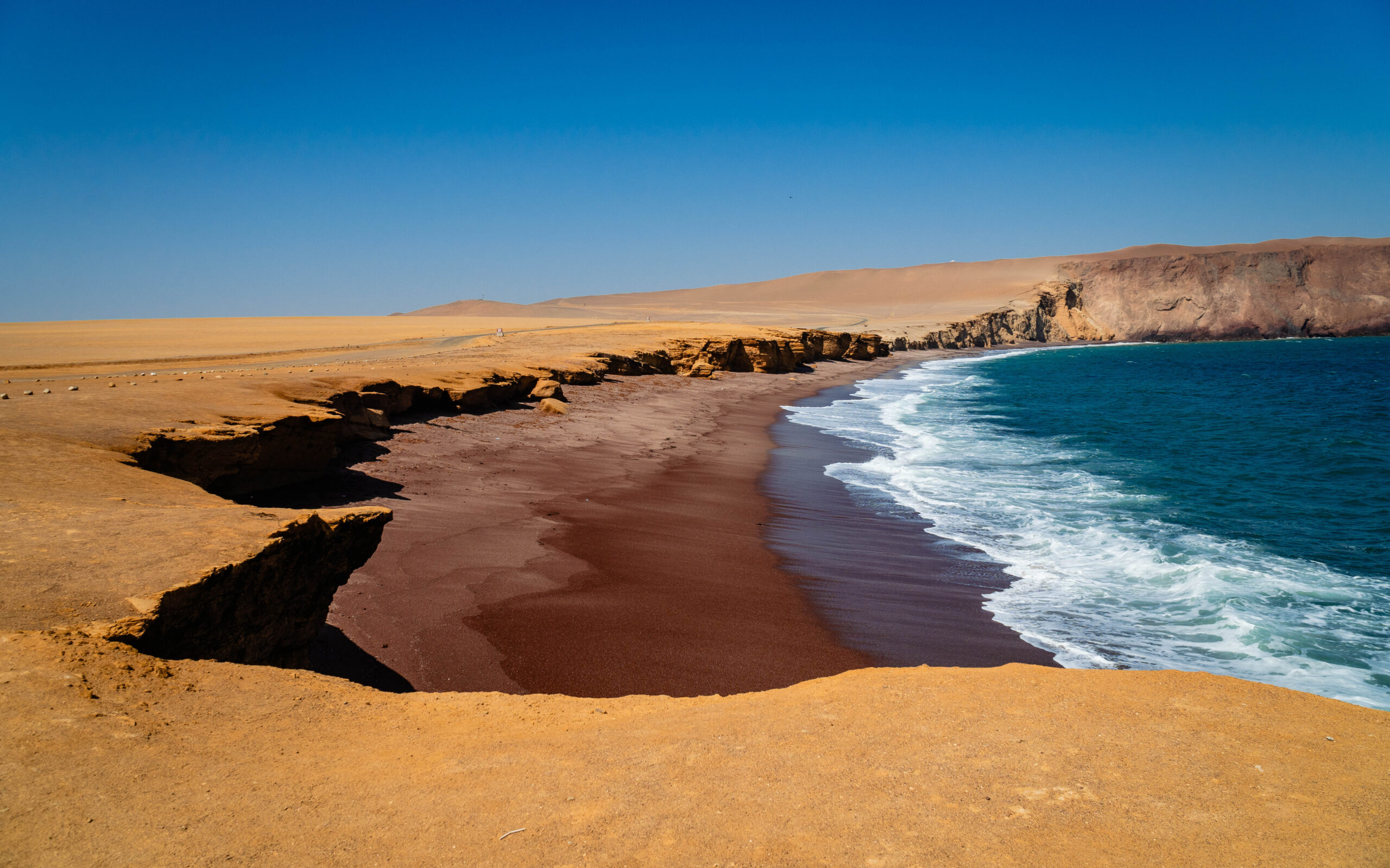 Jedno z najbardziej spektakularnych miejsc w Paracas, gdzie czerwony piastek spotyka sie z turkusowymoceanem. Kolor piasku wynika z wysokiej zawartości magnezu w piasku. To idealne miejsce na zdjęcia. Kontrast czerwonego piasku z turkusową wodą oceanu wygląda fenomenalnie.
